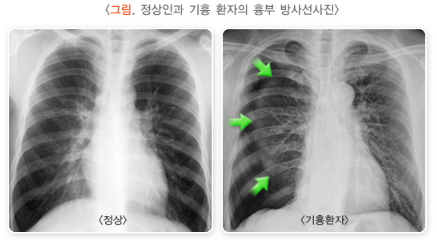 - 자발성 기흉 : 특별한 원인 없이 발생, 주로 키 크고 마른 청년층에서 흔함